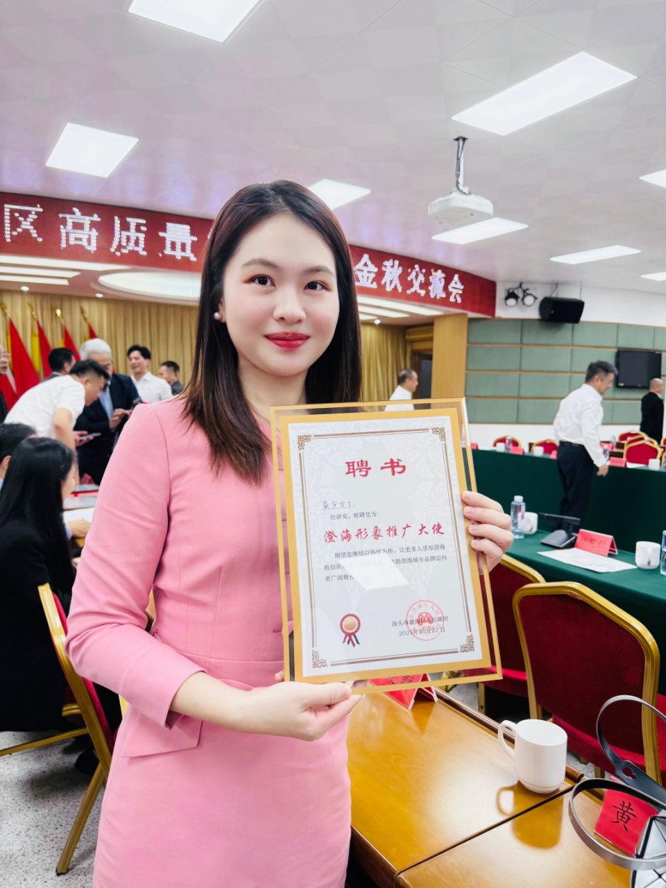 随后,澄海区人大常委会主任肖永彤代表区政府正式向首批13位“澄海形象推广大使”颁发了聘书,期望他们能充分发挥自身影响力,传播澄海声音,讲好澄海故事。北京潮人海外联谊会澄海南澳分会作为重要的宣传窗口,澄海南澳分会文化艺术顾问、中央广播电视总台原主持黄今,澄海南澳分会文化艺术顾问、视频号流量博主林曼,以及澄海南澳分会副秘书长陈淑淇等三位光荣地获得首批“澄海形象推广大使”聘书。