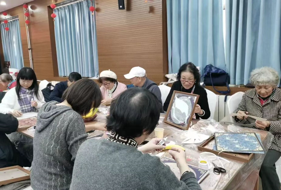 老侨们在工作人员的指导下,亲手制作了精美的宋锦珍珠画。自己动手将五种大小不一的珍珠贴在绢布上,制作成为自己喜欢的图案如游龙跑马、花草树木、或数字卡通等,活动既锻炼大家的手指功能,又能边手工制作边交流沟通,在动手动脑中感受乐趣,焕发活力。