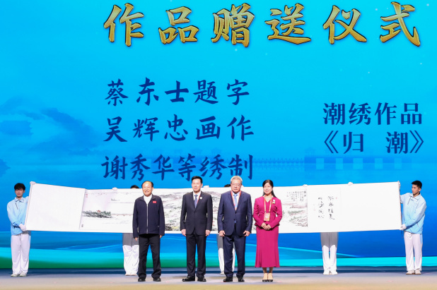 大会举行了作品赠送仪式:第二十三届国际潮团联谊年会筹委会向国际潮团总会赠送潮绣作品《归潮》作为留念;广东省美术家协会副主席、广东画院原副院长冯少协向潮州市饶宗颐博物馆捐赠油画作品《国学泰斗——饶宗颐》。