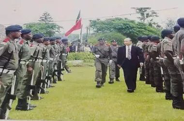 中国驻瓦努阿图黄东璧大使向瓦努阿图共和国元首递交国书后检阅总统府仪仗队